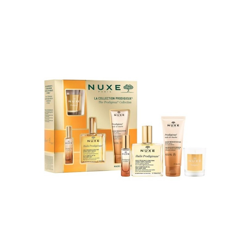 El nuxe cofre prodigioso es una invitación a sumergirte en un universo de bienestar y sofisticación. Su pieza estrella, el huile prodigieuse 100 ml, es un aceite seco multifunción que nutre, repara y sublima rostro, cuerpo y cabello con una textura sedosa y un perfume envolvente. Se complementa con un aceite de ducha perfumado, que limpia suavemente la piel mientras la deja hidratada y delicadamente aromatizada. Para completar la experiencia sensorial, el cofre incluye una vela aromática prodigieuse, ideal para crear una atmósfera cálida y relajante en tu hogar, y un perfume que prolonga el placer del característico aroma solar y floral de la línea. Un set perfecto para regalar o regalarte, diseñado para quienes desean un cuidado completo acompañado del refinamiento y la sensorialidad que definen a nuxe.