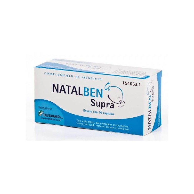 PROPIEDADESNATALBEN SUPRAES UN COMPLEMENTO ALIMENTICIO QUE AYUDA A CUBRIR LOS REQUERIMIENTOS NUTRICIONALES DE LA MUJERDURANTE EL EMBARAZO.DURANTE EL EMBARAZOSE PRODUCE UN AUMENTO DE LAS NECESIDADES DE VITAMINAS, MINERALES Y OLIGOELEMENTOS. ES UN PERIODO DE LA VIDA EN EL QUE SE DEBE PRESTAR ESPECIAL ATENCIÓN A LA DIETA, YA QUE LOS ALIMENTOS INGERIDOS POR LA MADRE SON LA PRINCIPAL FUENTE DE NUTRIENTES DEL BEBÉ.COMPOSICIÓN- ÁCIDO FÓLICO (VITAMINA B9) Y VITAMINA B12:EL ÁCIDO FÓLICO ES ESENCIAL PARA LA MULTIPLICACIÓN Y LA DIVISIÓN CELULAR. ESTA VITAMINA ACTÚA DESDE EL COMIENZO DE LA GESTACIÓN, POR LO QUE SE RECOMIENDA SU SUPLEMENTACIÓN EN LA MUJER EMBARAZADA. LA VITAMINA B12 INTERVIENE EN LA DIVISIÓN CELULAR JUNTO CON EL ÁCIDO FÓLICO.- YODO:ES NECESARIO PARA EL CORRECTO DESARROLLO DEL FETO. DURANTE EL EMBARAZO AUMENTAN LAS NECESIDADES DE YODO QUE ESTÁN RELACIONADAS CON UN CORRECTO CRECIMIENTO Y DESARROLLO INTELECTUAL DEL NIÑO.- HIERRO:EN EL EMBARAZO SE PRODUCE UN AUMENTO CONSIDERABLE DE LOS REQUERIMIENTOS DE HIERRO PARA ASEGURAR LAS RESERVAS DE LA MADRE Y EL ADECUADO APORTE AL BEBÉ. ES UN MINERAL MUY IMPORTANTE YA QUE GARANTIZA EL TRANSPORTE DE OXÍGENO A LAS CÉLULAS.- ÁCIDOS GRASOS OMEGA-3:SON NUTRIENTES ESENCIALES PARA EL ORGANISMO QUE SÓLO PUEDEN SER INGERIDOS CON LA DIETA. EL DHA CONTRIBUYE AL DESARROLLO CEREBRAL, VISUAL Y OCULAR DEL BEBÉ.- VITAMINA D:SE PRECISAN NIVELES ADECUADOS DE VITAMINA D EN LA MADRE DURANTE EL EMBARAZO PARA QUE EL CALCIO SE ABSORBA CORRECTAMENTE. ADEMÁS, LA VITAMINA D ES NECESARIA PARA EL CRECIMIENTO Y EL DESARROLLO NORMAL DE LOS HUESOS EN LOS NIÑOS.