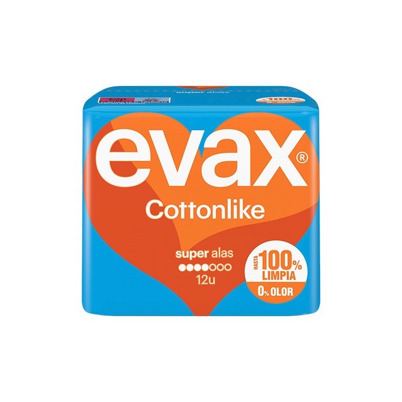 PRUEBA EVAX COTTONLIKE Y NO TE VAS A ACORDAR DE QUE LAS ESTÁS USANDO. GRACIAS AL SISTEMA EVAX COTTONLIKE DUAL CON PERLAS ACTIVAS QUE NEUTRALIZAN EL OLOR Y UN NÚCLEO QUE CAPTURA EL FLUJO AL INSTANTE, EVAX TE OFRECE UNA ABSORCIÓN QUE TE MANTIENE HASTA 100% LIMPIA Y 0% SIN RASTRO DE OLOR. SUS ALAS MANTIENEN LA COMPRESA EN SU SITIO Y LA COBERTURA COTTONLIKE TE OFRECE UN CONFORT DURADERO.HAY DIFERENTES TIPOS DE COMPRESAS EVAX, SEGÚN TU FLUJO: USA EVAX COTTONLIKE SUPER CON ALAS PARA LOS DÍAS DE FLUJO ABUNDANTE.