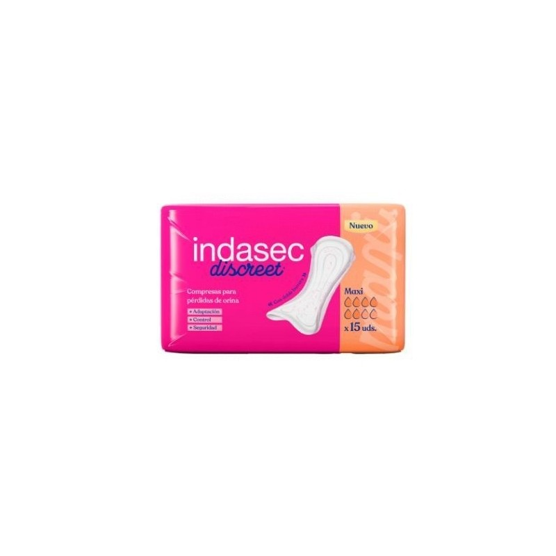 INDASEC DISCREET® MAXI PERMITE DISFRUTAR DE CADA MOMENTO A LAS MUJERES QUE TIENEN PÉRDIDAS MÁS ABUNDANTES.SE ADAPTA PERFECTAMENTE A TU ROPA INTERIOR Y OFRECE LA MAYOR SEGURIDAD Y CONTROL DEL OLOR PARA QUE NO TENGAS QUE PREOCUPARTE POR NADA.ESTA COMPRESA OFRECE SU MÁXIMA EFICACIA PARA GARANTIZAR LA SEGURIDAD GRACIAS A:INDASEC DISCREET® ES UNA COMPRESA ULTRAFINA GRACIAS A LA EXCLUSIVA TECNOLOGÍA INNOVATHIN®. UN MATERIAL ABSORBENTE DE NUEVA GENERACIÓN, MÁS CONCENTRADO QUE LA CELULOSA, CON UNA ALTA CAPACIDAD DE ABSORCIÓN Y RETENCIÓN, QUE PERMITE OBTENER, UNO DE LOS DOS NÚCLEOS DE LA COMPRESA MÁS FINO.LA INNOVADORA INDASEC DISCREET® INCORPORA LOS NUEVOS CANALES DE DIFUSIÓN, GARANTIZANDO UNA RÁPIDA DISTRIBUCIÓN DEL LÍQUIDO A LO LARGO DE TODA LA COMPRESA, ELIMINANDO LA SENSACIÓN DE HUMEDAD.ES LA ÚNICA COMPRESA DEL MERCADO CON DOBLE BARRERA ANTIESCAPE, OFRECIENDO UNA MAYOR SEGURIDAD.INDASEC DISCREET® TAMBIÉN INCORPORA LA TECNOLOGÍA GELBLOCK®, GRACIAS A LA CUAL NO SOLO NEUTRALIZA EL OLOR, SINO QUE ADEMÁS LO BLOQUEA, DESTRUYENDO LAS BACTERIAS QUE LO PRODUCEN Y EVITANDO QUE NI SIQUIERA LLEGUE A APARECER.EN EL DESARROLLO DE ESTA NUEVA COMPRESA CONTINUAMOS PREOCUPÁNDONOS DEL CUIDADO DE LA PIEL DE LA ZONA ÍNTIMA FEMENINA. X3 DERMOPROTECCIÓN, UNA LOCIÓN A BASE DE 3 COMPONENTES NATURALES PARA UNA MAYOR PROTECCIÓN PARA LA PIEL. UNA EXCLUSIVA EMULSIÓN DE GROSELLA NEGRA, ALOE VERA Y EXTRACTO DE AMBIATY.