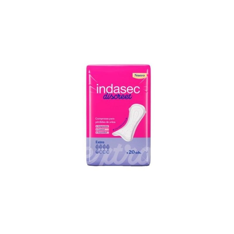 INDASEC DISCREET® EXTRA ES LA SOLUCIÓN IDEAL PARA CONTROLAR PÉRDIDAS LEVES HABITUALES. SE ADAPTA PERFECTAMENTE A LA ROPA INTERIOR Y OFRECE LA SEGURIDAD NECESARIA PARA LLEVAR UNA VIDA SIN LIMITACIONES.ESTA COMPRESA OFRECE SU MÁXIMA EFICACIA PARA GARANTIZAR LA SEGURIDAD GRACIAS A:INDASEC DISCREET® ES UNA COMPRESA ULTRAFINA GRACIAS A LA EXCLUSIVA TECNOLOGÍA INNOVATHIN®. UN MATERIAL ABSORBENTE DE NUEVA GENERACIÓN, MÁS CONCENTRADO QUE LA CELULOSA, CON UNA ALTA CAPACIDAD DE ABSORCIÓN Y RETENCIÓN, QUE PERMITE OBTENER, UNO DE LOS DOS NÚCLEOS DE LA COMPRESA MÁS FINO.LA INNOVADORA INDASEC DISCREET® INCORPORA LOS NUEVOS CANALES DE DIFUSIÓN, GARANTIZANDO UNA RÁPIDA DISTRIBUCIÓN DEL LÍQUIDO A LO LARGO DE TODA LA COMPRESA, ELIMINANDO LA SENSACIÓN DE HUMEDAD.ES LA ÚNICA COMPRESA DEL MERCADO CON DOBLE BARRERA ANTIESCAPE, OFRECIENDO UNA MAYOR SEGURIDAD.INDASEC DISCREET® TAMBIÉN INCORPORA LA TECNOLOGÍA GELBLOCK®, GRACIAS A LA CUAL NO SOLO NEUTRALIZA EL OLOR, SINO QUE ADEMÁS LO BLOQUEA, DESTRUYENDO LAS BACTERIAS QUE LO PRODUCEN Y EVITANDO QUE NI SIQUIERA LLEGUE A APARECER.EN EL DESARROLLO DE ESTA NUEVA COMPRESA CONTINUAMOS PREOCUPÁNDONOS DEL CUIDADO DE LA PIEL DE LA ZONA ÍNTIMA FEMENINA. X3 DERMOPROTECCIÓN, UNA LOCIÓN A BASE DE 3 COMPONENTES NATURALES PARA UNA MAYOR PROTECCIÓN PARA LA PIEL. UNA EXCLUSIVA EMULSIÓN DE GROSELLA NEGRA, ALOE VERA Y EXTRACTO DE AMBIATY.